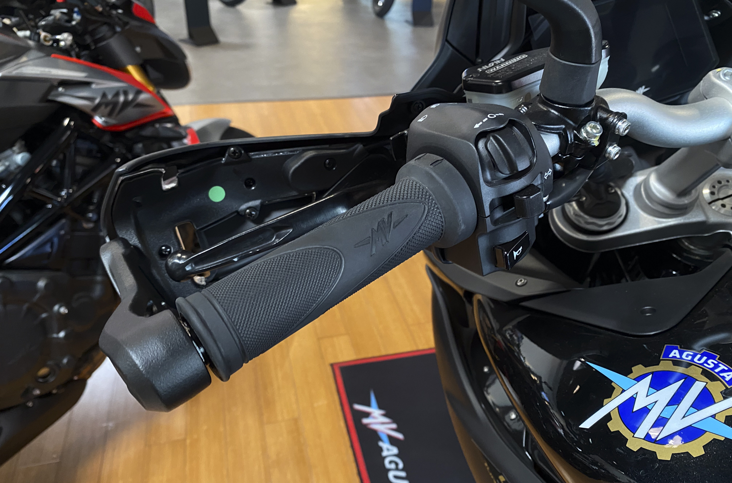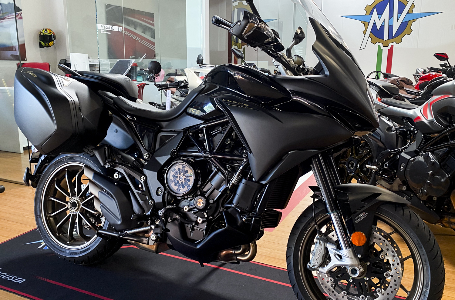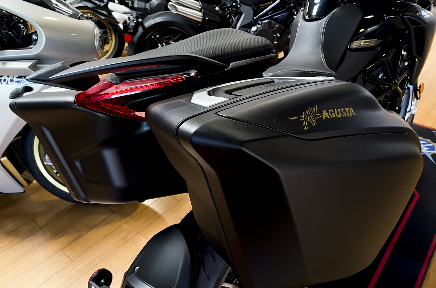 Included accessories Heated Grips - Bluetooth - Cruise control - GPS sensor - Central stand - Adjustable windshield - Bags 34 l (8.98 U.S. gal. each) - MV Ride App for navigation mirroring, app-controlled engine, rider aids setup - Mobisat anti-theft system with geolocation