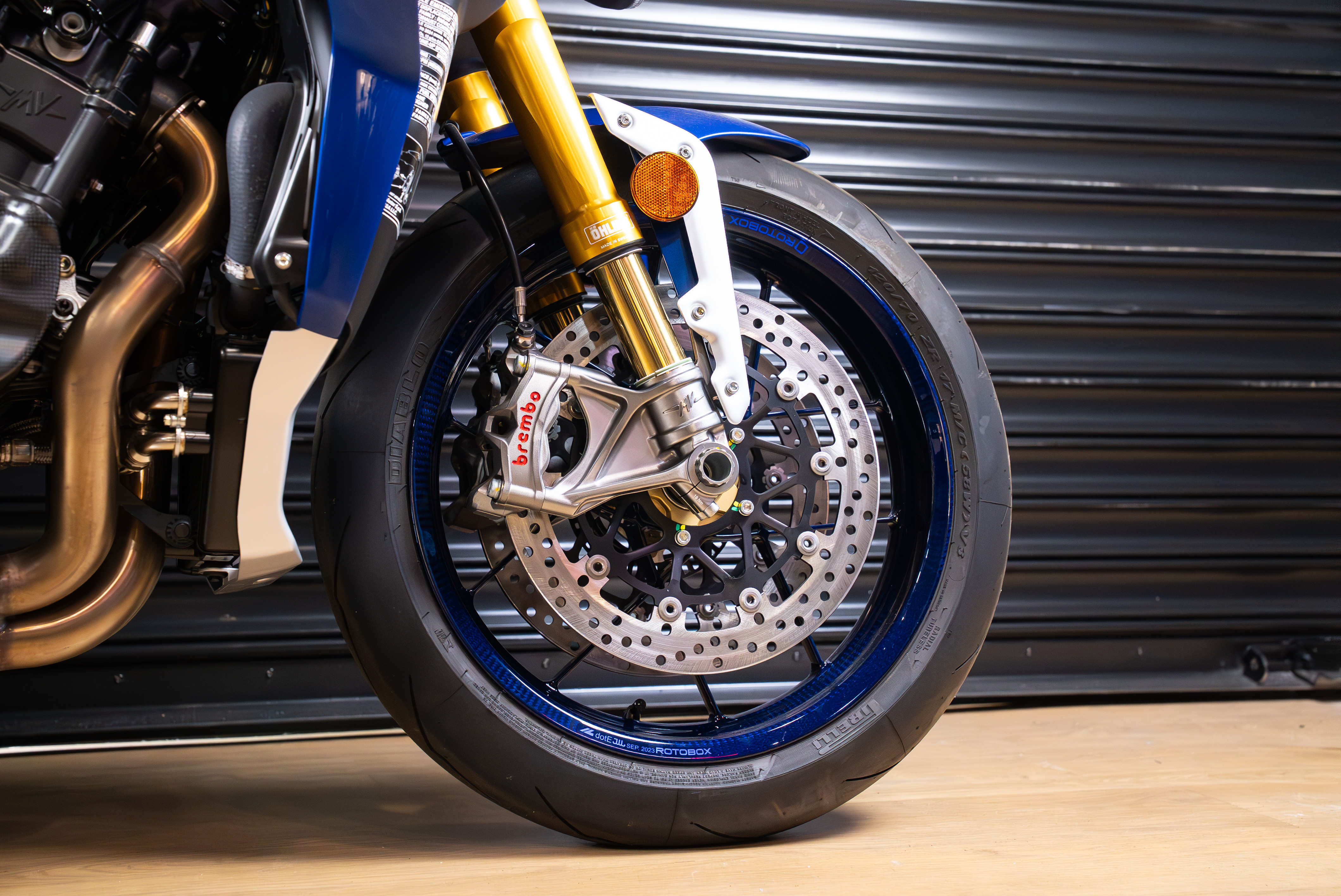 Front Suspension: Öhlins Nix EC hydraulic “upside down” front forks with TiN superficial treatment. Completely adjustable with electronically controlled compression and rebound damping with manually controlled spring preload.