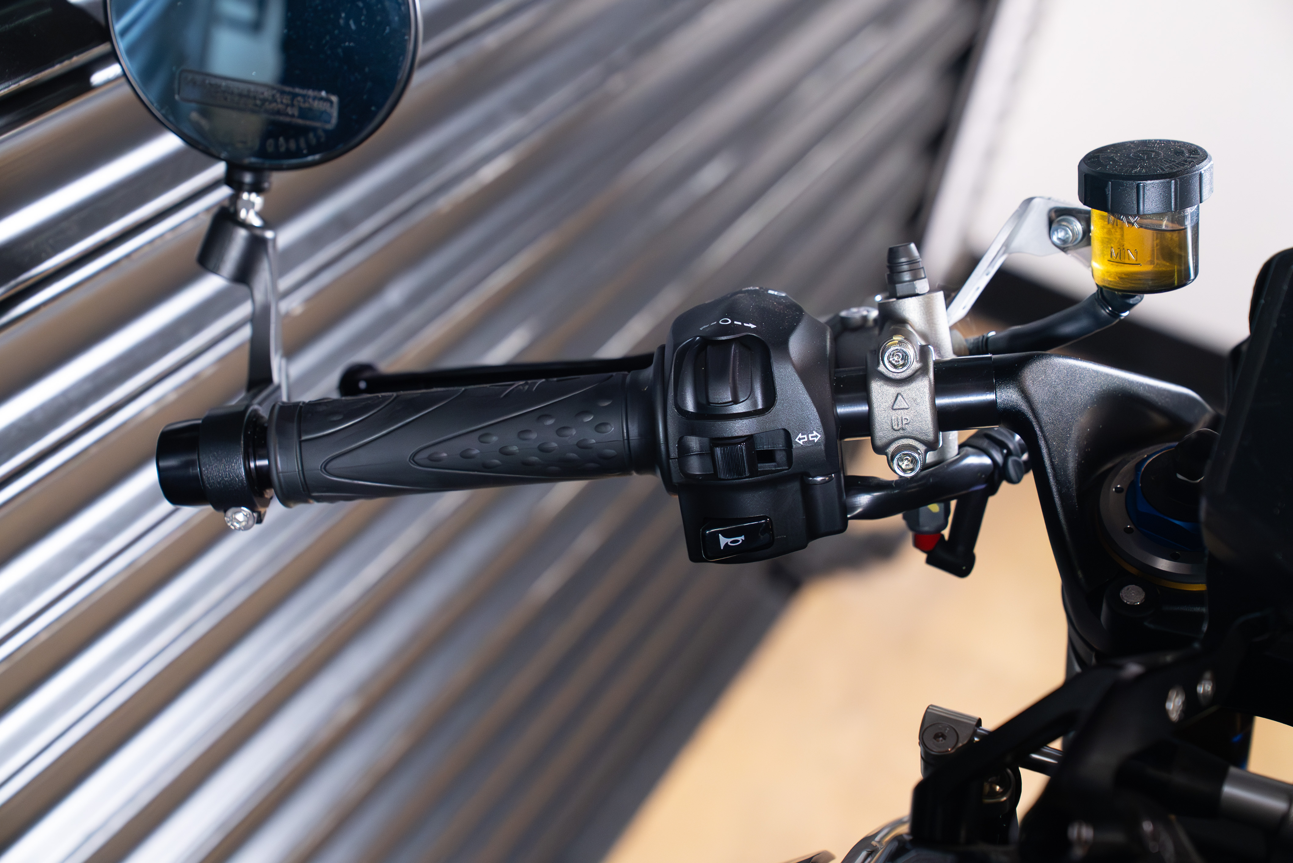 Carbon fiber is used for many of the parts including the heat shields that protect the exhaust manifolds on each side of the bike and all the style elements making up the front light set, as well as the panels in the tank area.
