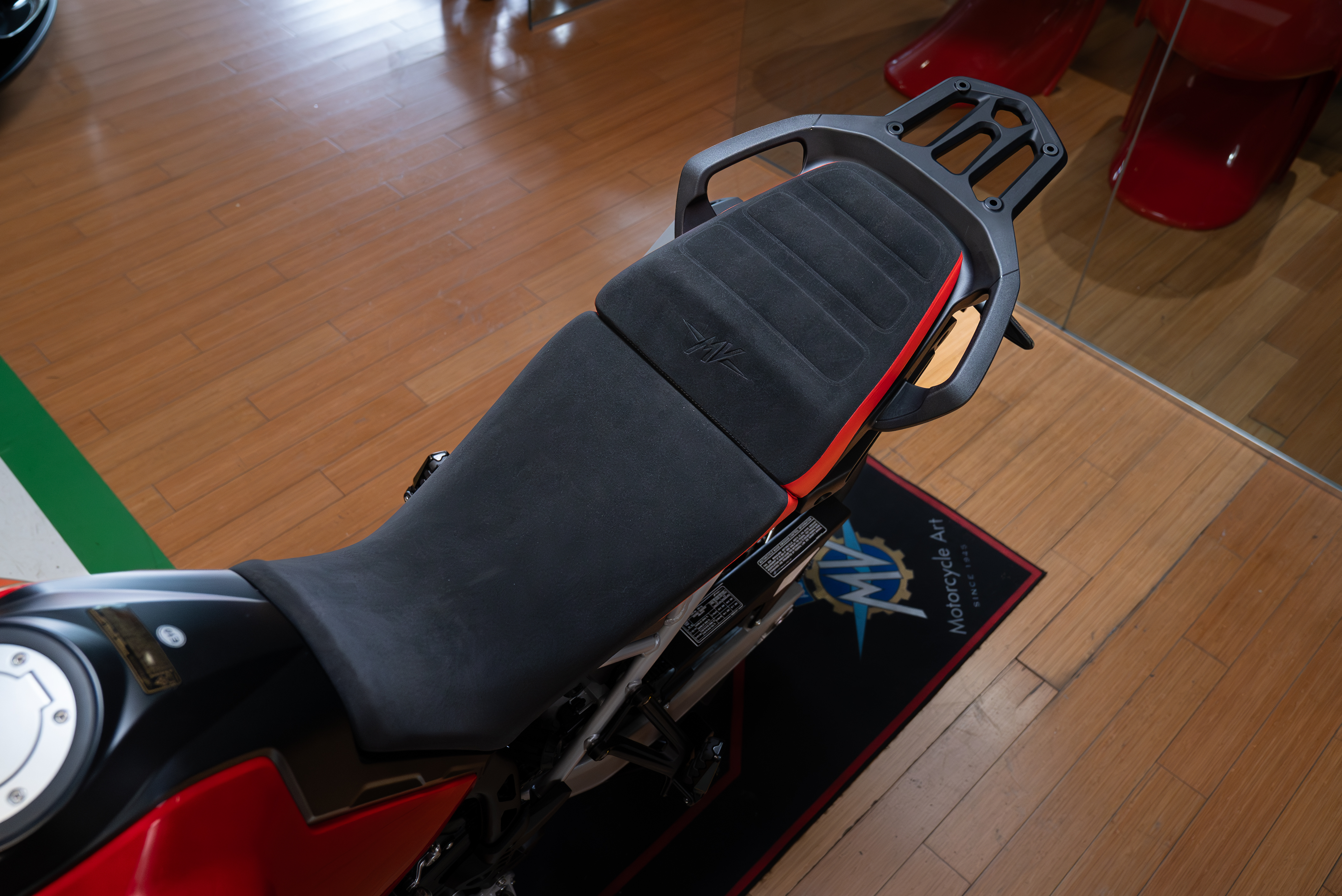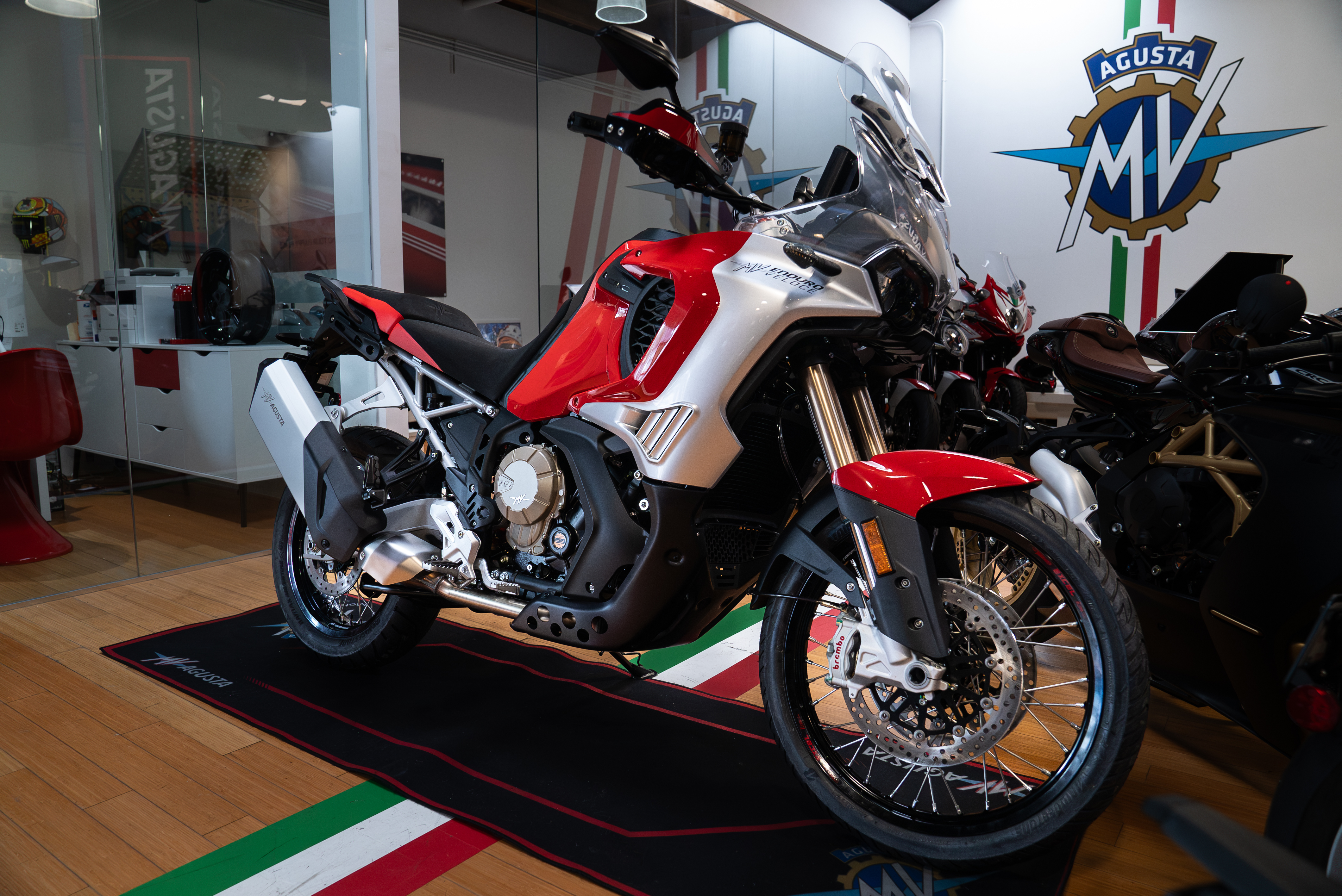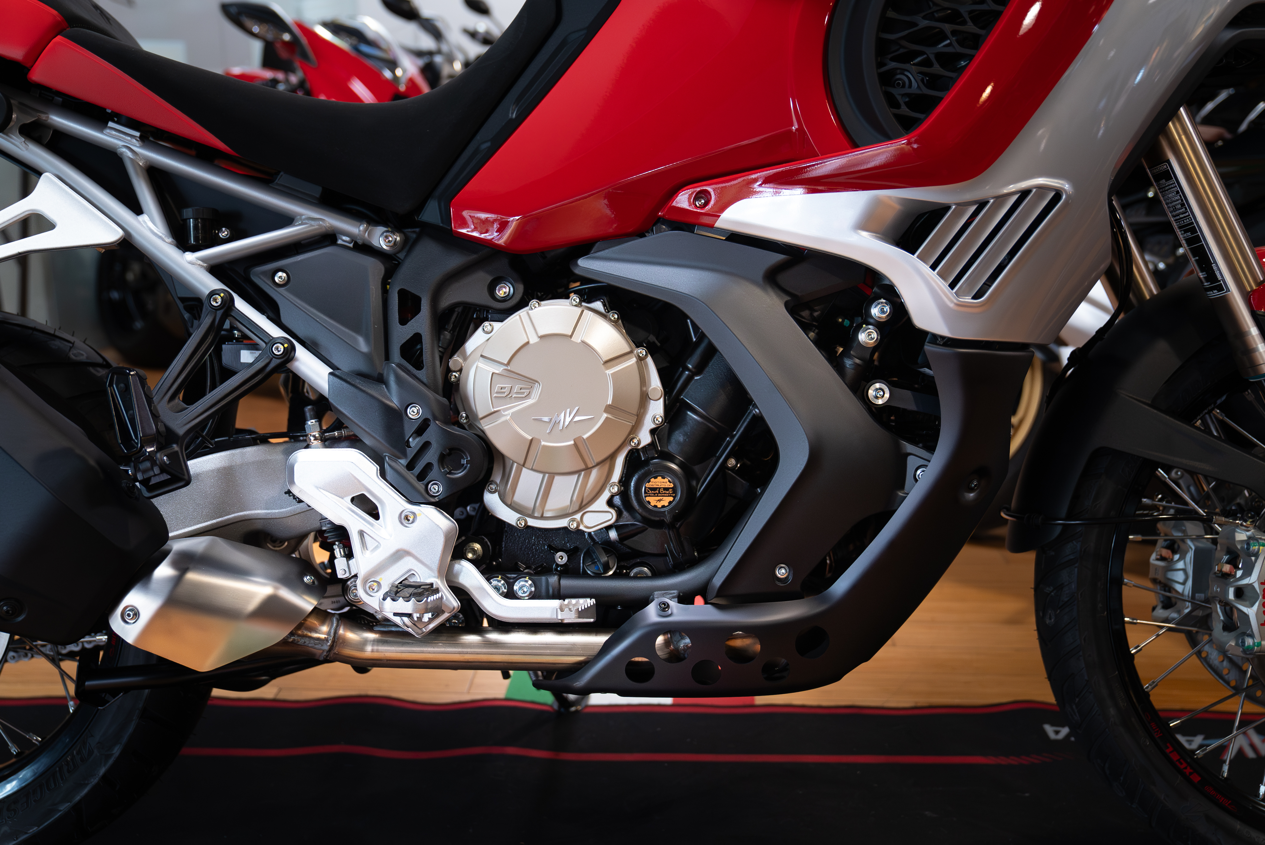 STYLE: The Enduro Veloce epitomises MV Agusta's aesthetic standards. And, like every MV, it must be recognisable at first glance, identified as a member of that exclusive club reserved for the world's most beautiful bikes. The heritage and grandeur of the past live on in a radically contemporary object. An evocative style element is the iconic Ago Red and Ago Silver colour combination, which boosts the distinctive design of the motorcycle.