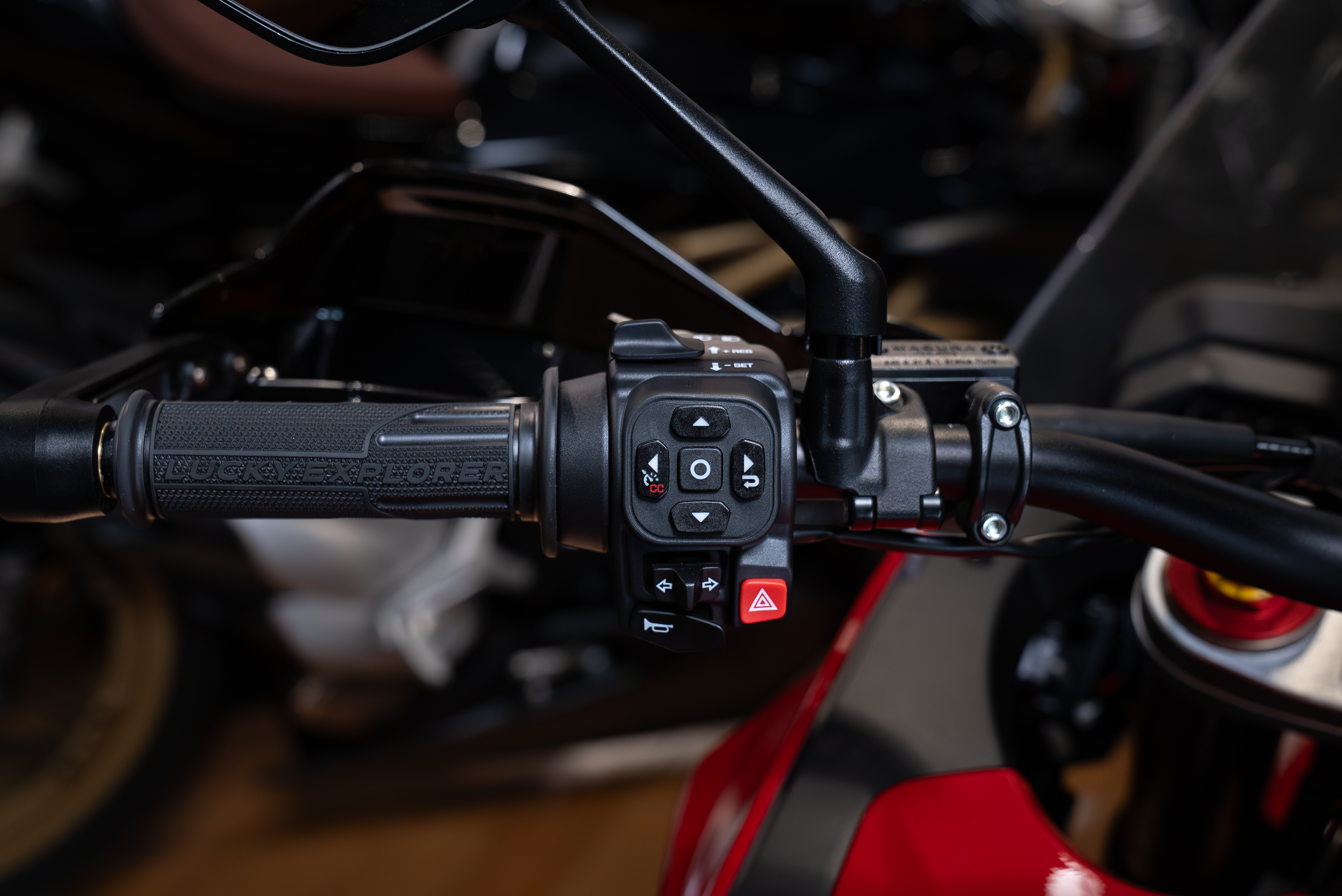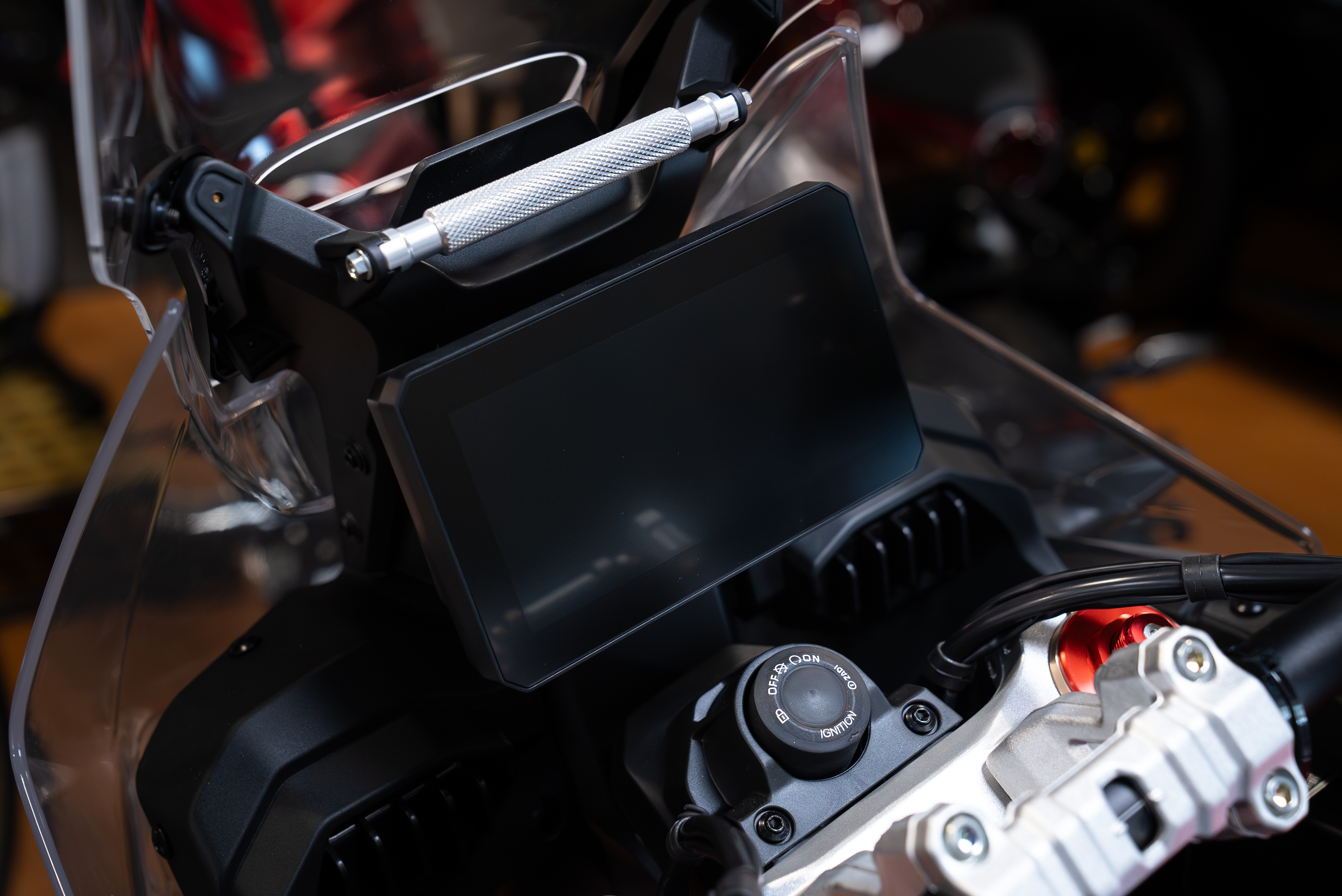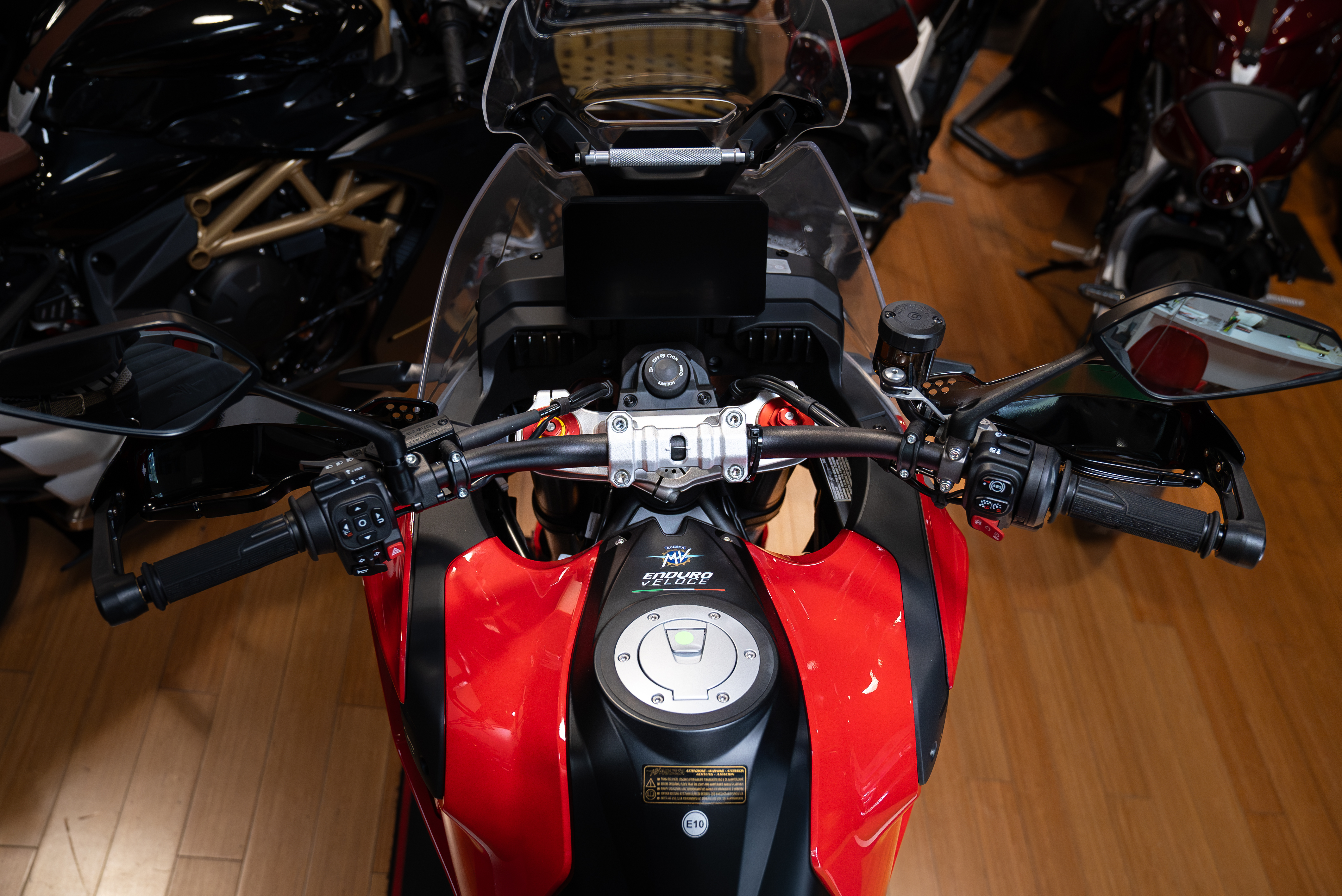 ELECTRONICS: The Enduro Veloce boasts four riding modes: Urban, Touring, Off-Road and Custom All-Terrain. Traction control offers eight levels of intervention, with five dedicated to road use, two for off-road use, and one for use on wet surfaces. Through the main menu, it is possible to adapt the electronic response of the ECU based on the tyres that the rider chooses to mount (road or off-road tyres). There are two levels of engine brake intervention. The Enduro Veloce is equipped with Cruise Control and Launch Control. The 7-inch HD TFT screen allows for Bluetooth and Wi-Fi connection and can be adjusted in terms of brightness and graphics layout.