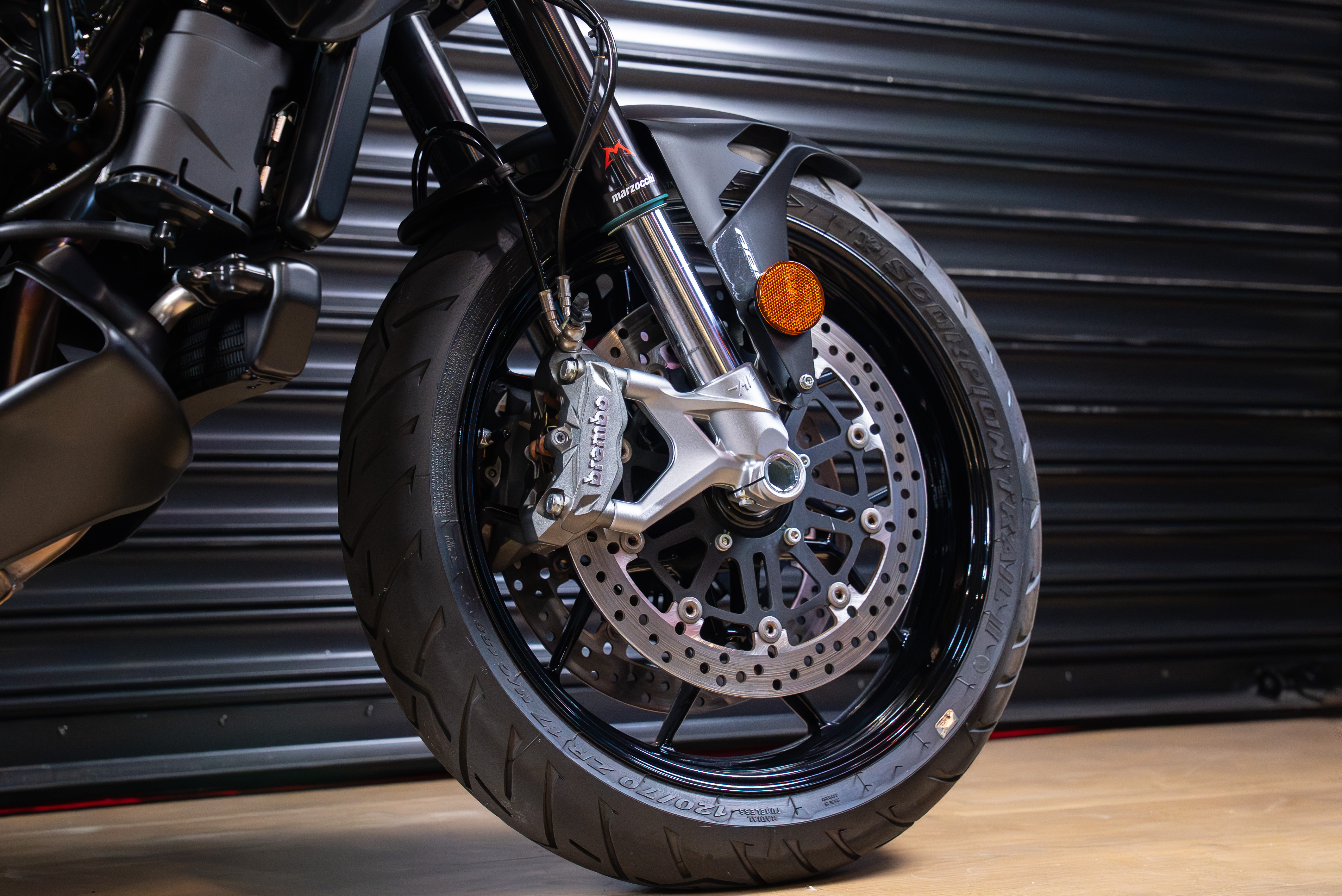 Front: Dual 320 mm floating discs with Brembo four-piston calipers