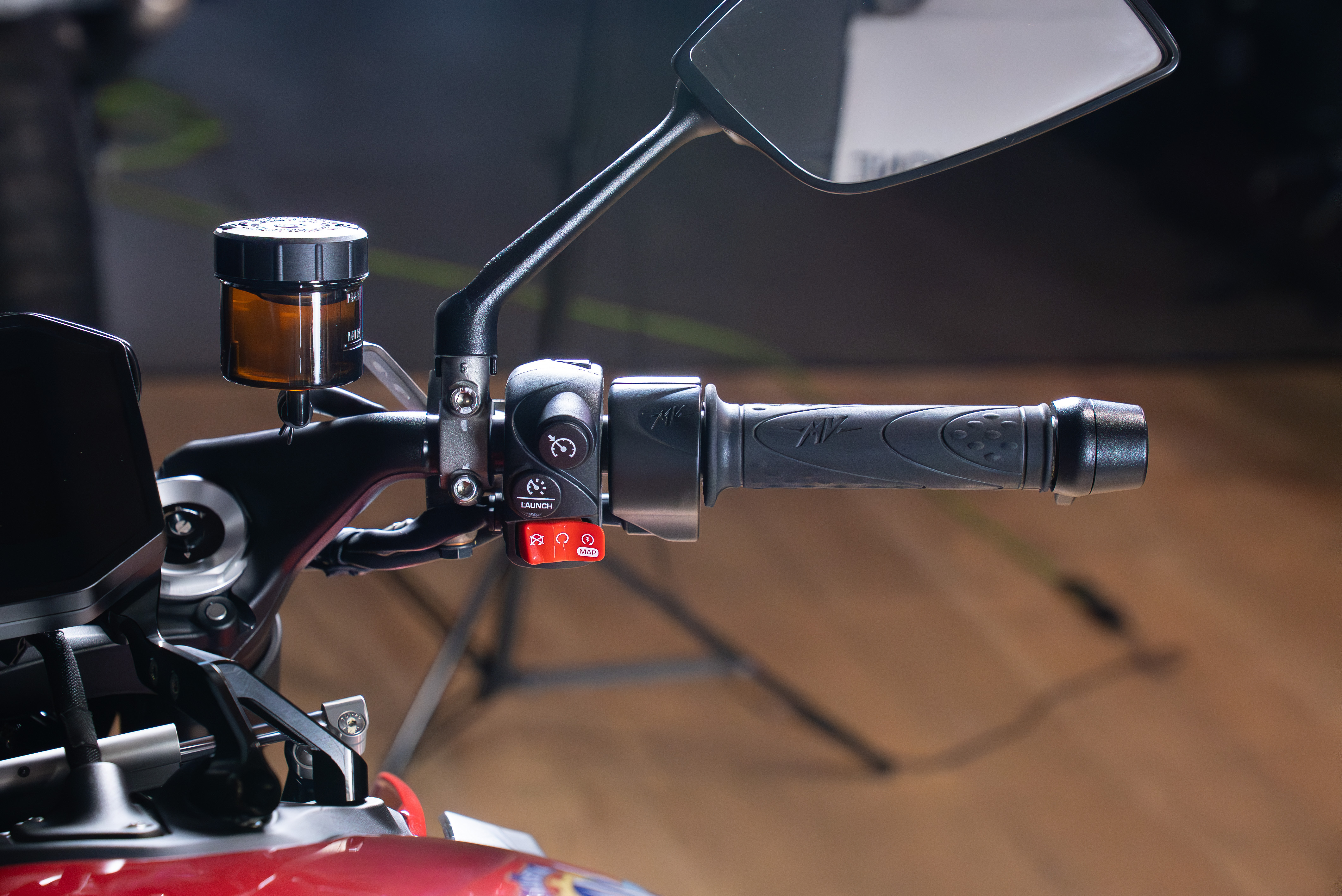 Integrated ignition - injection system MVICS 2.1 (Motor & Vehicle Integrated Control System) with eight injectors (4 lower fuel injectors by Mikuni + 4 upper fuel injectors by Magneti Marelli with increased fuel flow). Engine control unit Eldor Nemo 2.1, throttle body bore 50 mm diameters full ride by wire Mikuni, pencil-coil with ion-sensing technology, control of detonation and misfire Torque control with four maps. Traction control with 8 levels + off and wheelie control with inertial platform